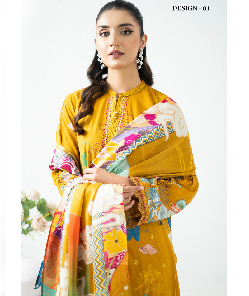 Lalam by Binaas- 01 * Digital Printed Lawn Embroidered * Neck With Boring Embroidered Front * Digital Printed Lawn Back * Digital Printed Lawn Sleeves * Digital Printed Silk Duppata * Dyed Cambric Cotton Trouser