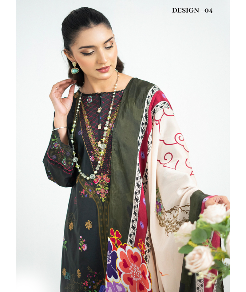 Lalam by Binaas- 04 * Digital Printed Lawn Embroidered * Neck With Boring Embroidered Front * Digital Printed Lawn Back * Digital Printed Lawn Sleeves * Digital Printed Silk Duppata * Dyed Cambric Cotton Trouser