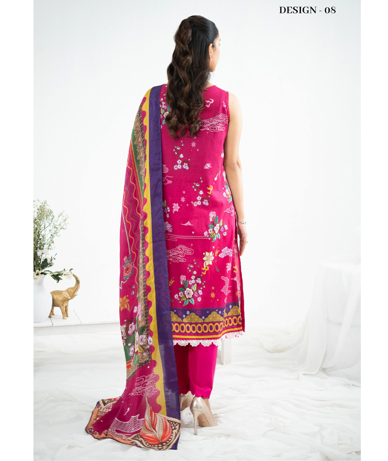 Lalam by Binaas- 08 * Digital Printed Lawn Embroidered * Neck With Boring Embroidered Front * Digital Printed Lawn Back * Digital Printed Lawn Sleeves * Digital Printed Silk Duppata * Dyed Cambric Cotton Trouser