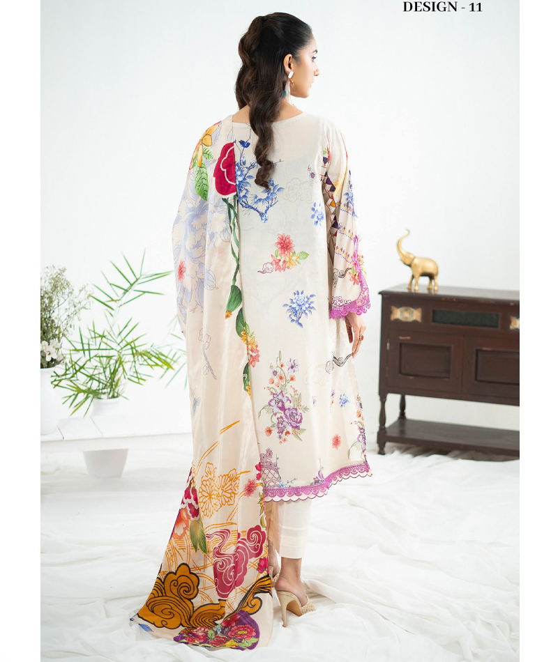 Lalam by Binaas- 11 * Digital Printed Lawn Embroidered * Neck With Boring Embroidered Front * Digital Printed Lawn Back * Digital Printed Lawn Sleeves * Digital Printed Silk Duppata * Dyed Cambric Cotton Trouser