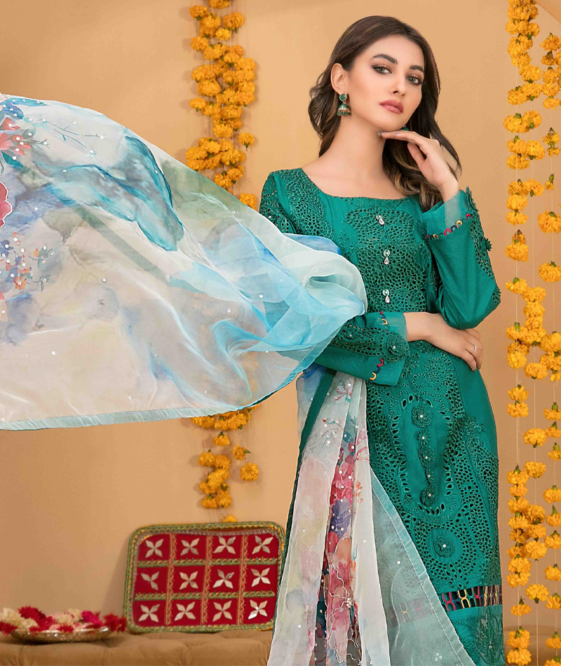 Zala by Tawakkal- D2592 * Shirt- Embroidered Lawn * Dupatta- Embroidered Fancy Dupatta * Trouser- Cotton Fabrics