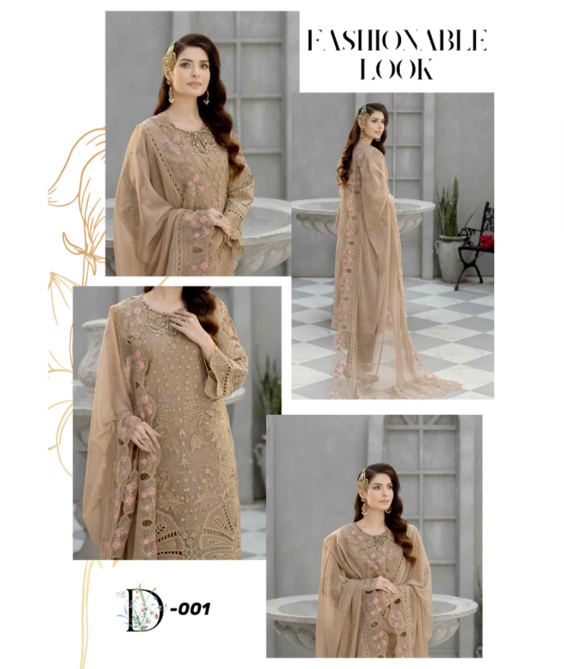 Laira Luxury Chiffon D-001 * SHIRT:- Semi-Stitched Heavy Embroidered Chiffon Shirt * DUPATTA:- Heavy Embroidered Organza/Chiffon Dupatta * TROUSER:- Grip RawSilk Trouser