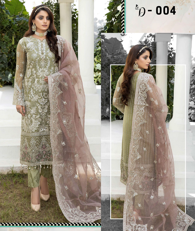 Laira Luxury Chiffon D-004 * SHIRT:- Semi-Stitched Heavy Embroidered Chiffon Shirt * DUPATTA:- Heavy Embroidered Organza/Chiffon Dupatta * TROUSER:- Grip RawSilk Trouser