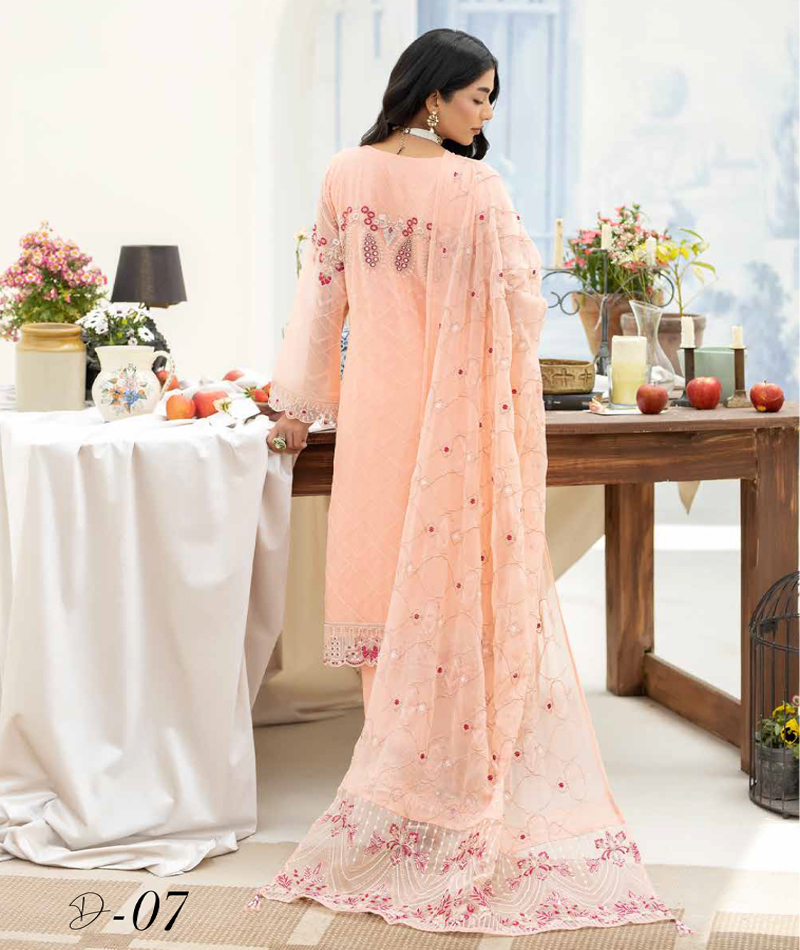 Elif Luxury Chiffon D-07 * SHIRT:- Chiffon PARTY WEAR SHIRT * DUPATTA:- EMBROIDERED CHIFFON DUPATTA * TROUSER:- COTTON TROUSER