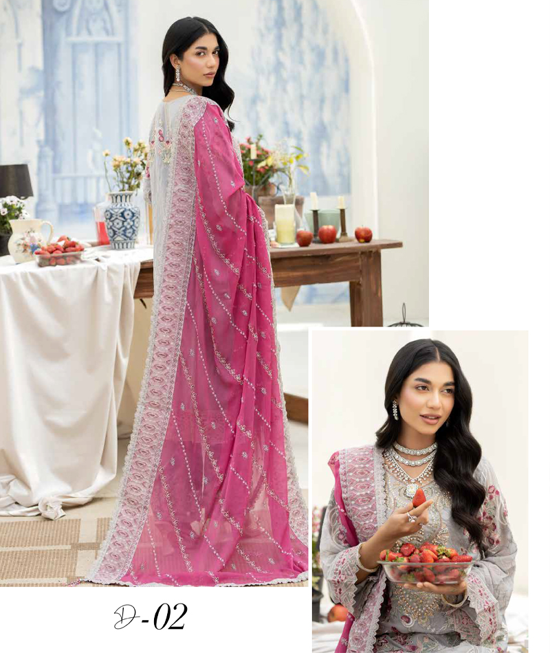 Koel Luxury Chiffon D-02 * SHIRT:- Chiffon PARTY WEAR SHIRT * DUPATTA:- EMBROIDERED CHIFFON DUPATTA * TROUSER:- EMBROIDERED CUTWORK Silk TROUSER