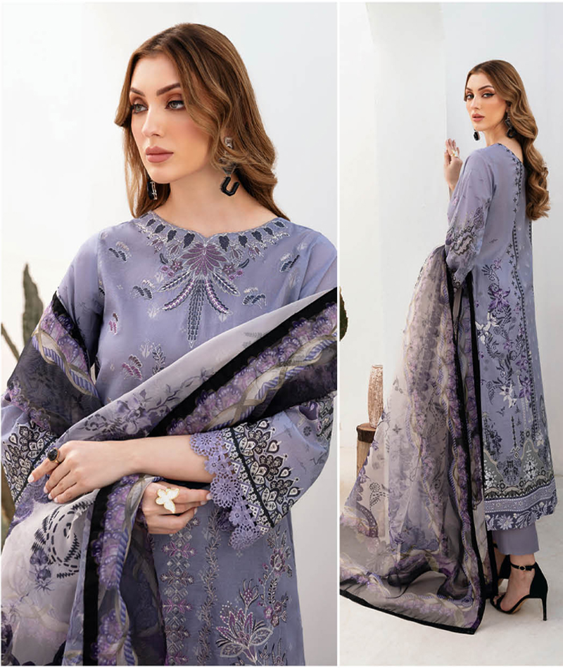 Ghazal Luxury Lawn G-202 * Embroidered Premium Lawn Dress * Digital Printed back & Sleeve * Digital Printed Chiffon/Silk Dupatta * Cotton Pant