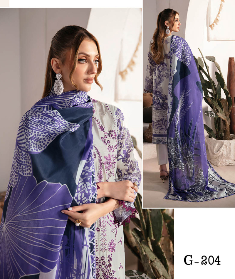 Ghazal Luxury Lawn G-204 * Embroidered Premium Lawn Dress * Digital Printed back & Sleeve * Digital Printed Chiffon/Silk Dupatta * Cotton Pant