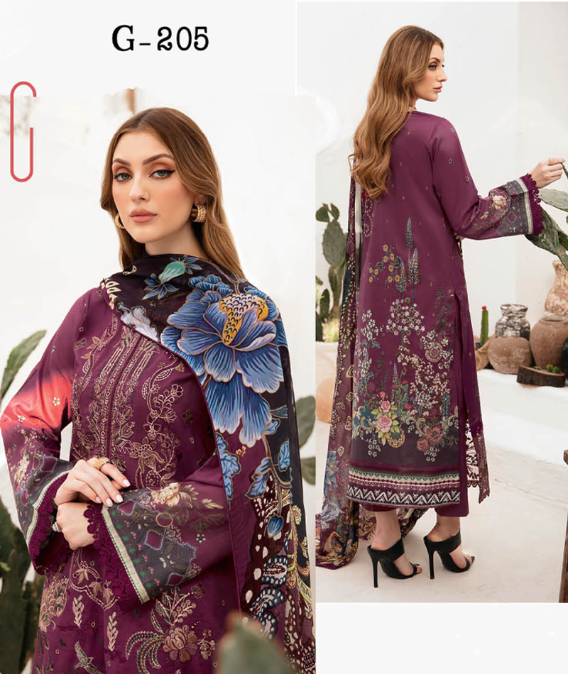 Ghazal Luxury Lawn G-205 * Embroidered Premium Lawn Dress * Digital Printed back & Sleeve * Digital Printed Chiffon/Silk Dupatta * Cotton Pant