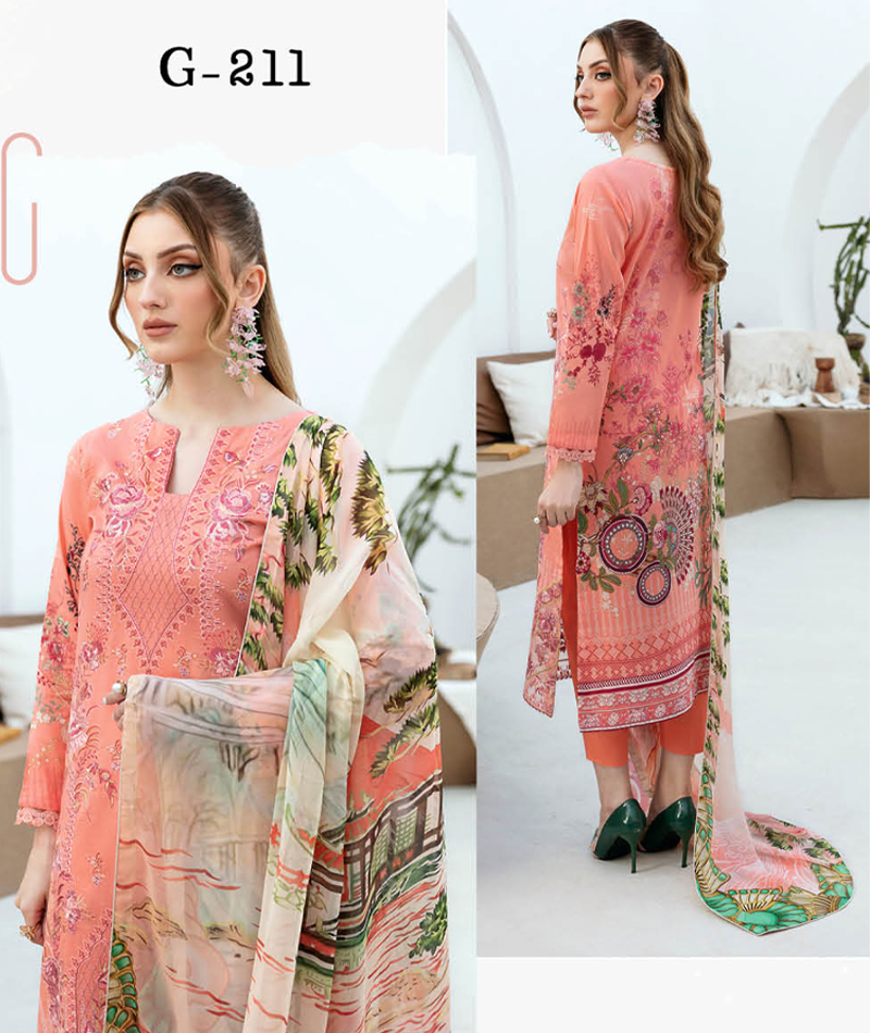 Ghazal Luxury Lawn G-211 * Embroidered Premium Lawn Dress * Digital Printed back & Sleeve * Digital Printed Chiffon/Silk Dupatta * Cotton Pant