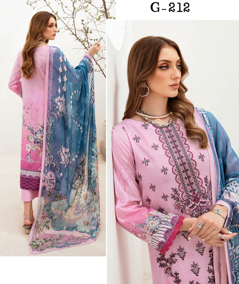 Ghazal Luxury Lawn G-212 * Embroidered Premium Lawn Dress * Digital Printed back & Sleeve * Digital Printed Chiffon/Silk Dupatta * Cotton Pant