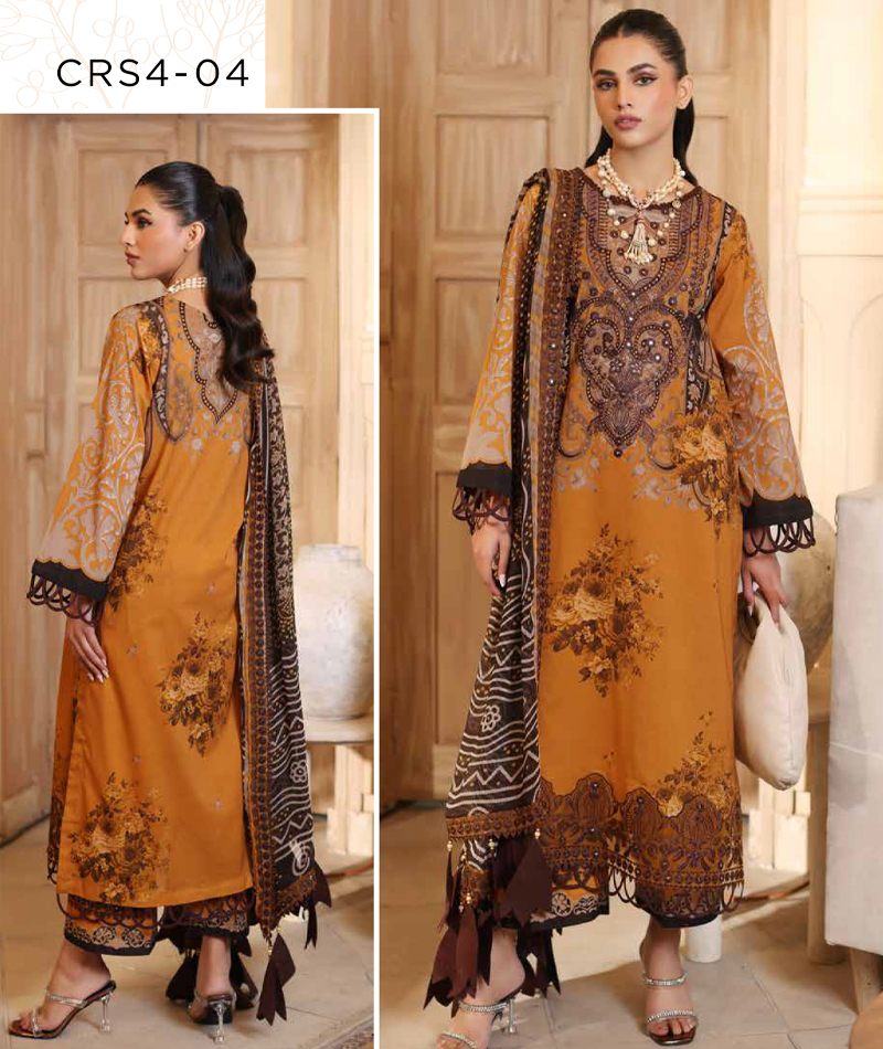 Reem Emb Lawn Chiffon CRS4-04 * Embroidered Printed lawn Front * Printed Lawn Back+Sleeves * Printed Cotton Trouser * Printed Chiffon Dupatta