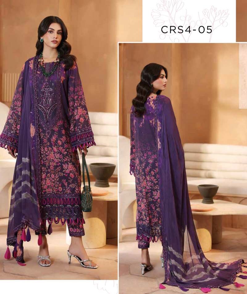Reem Emb Lawn Chiffon CRS4-05 * Embroidered Printed lawn Front * Printed Lawn Back+Sleeves * Printed Cotton Trouser * Printed Chiffon Dupatta