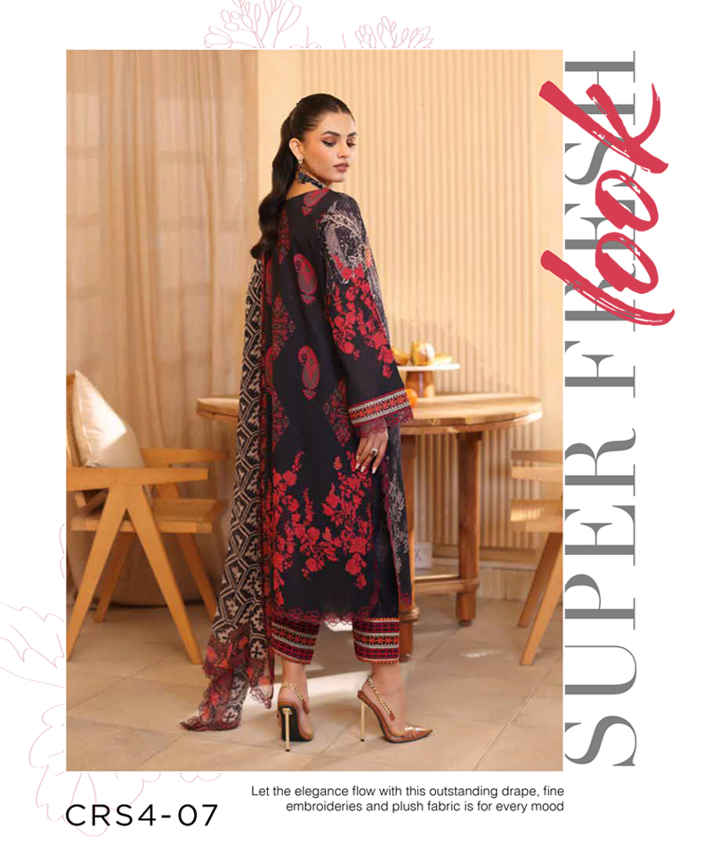 Reem Emb Lawn Chiffon CRS4-07 * Embroidered Printed lawn Front * Printed Lawn Back+Sleeves * Printed Cotton Trouser * Printed Chiffon Dupatta