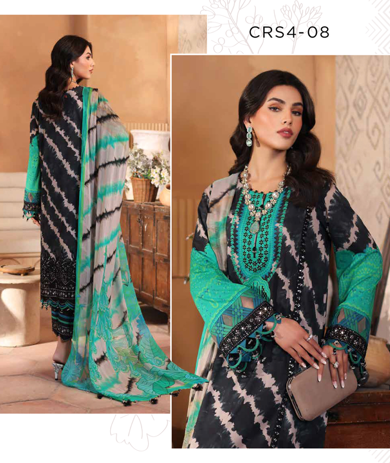 Reem Emb Lawn Chiffon CRS4-08 * Embroidered Printed lawn Front * Printed Lawn Back+Sleeves * Printed Cotton Trouser * Printed Chiffon Dupatta