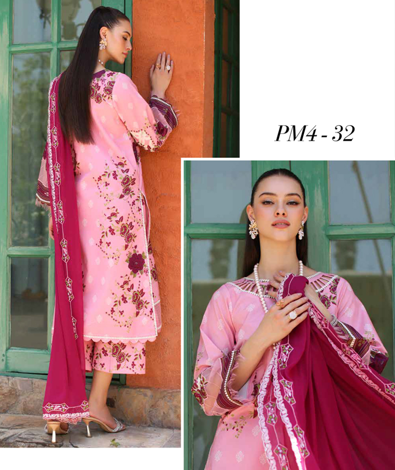 Print Melody Vol 04 PM4-32 * Printed Lawn Front+Back+Sleeves * Printed Cotton Trouser * Embroideried Dyed Chiffon Dupatta * Embroidered Dupatta Patti