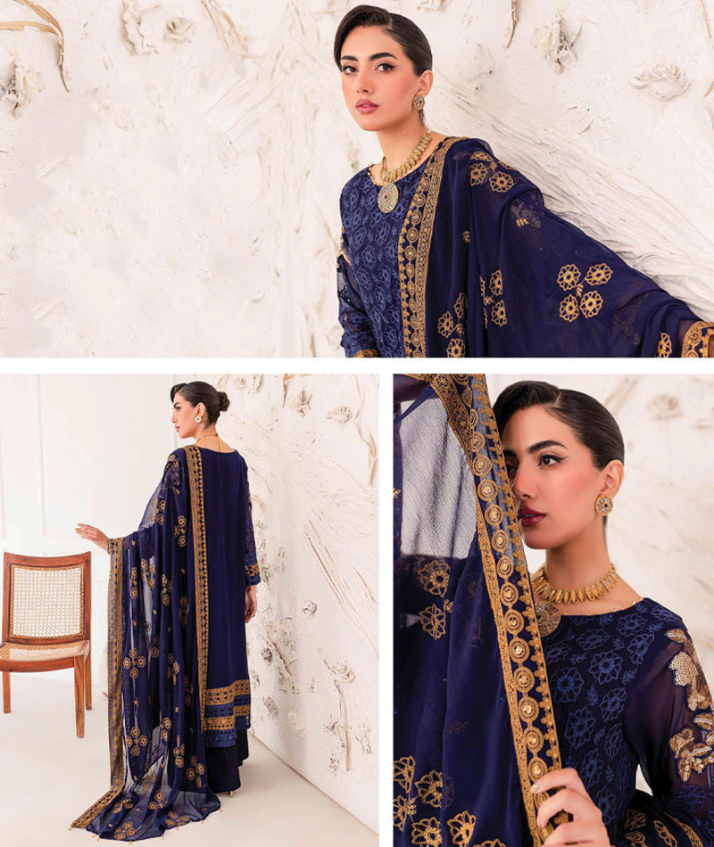 Zarposh Unstitched Chiffon CZP3-06 * EMB FRONT DYED CHIFFON * EMB DYED CHIFFON SLEEVES * CHIFFON DYED BLACK * EMB BACK DAMAN PATTI * RAW SILK DYED TROUSER * EMB DYED CHIFFON DUPATTA