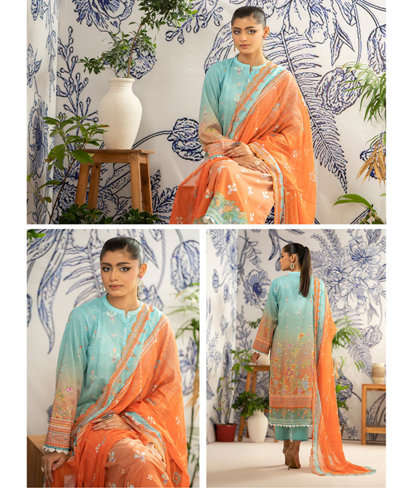 ROSHNAI VOL-01 ARTICLE-A6 * Digital Printed Embroidered Lawn Dress * Digital Printed Bamber Chiffon Dupatta * Dyed Cambric Cotton Trouser