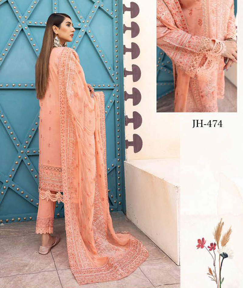 Pinks Vol-03 JH-474 * Heavy Embroidered Shirt * Embroidered Back * Embroidered Sleeves * Embroidered chiffon Dupatta * Plain Trouser * Embroidered Tissue