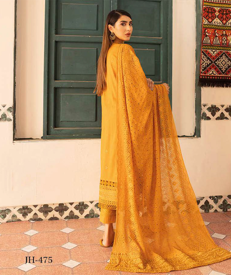 Pinks Vol-03 JH-475 * Heavy Embroidered Shirt * Embroidered Back * Embroidered Sleeves * Embroidered chiffon Dupatta * Plain Trouser * Embroidered Tissue