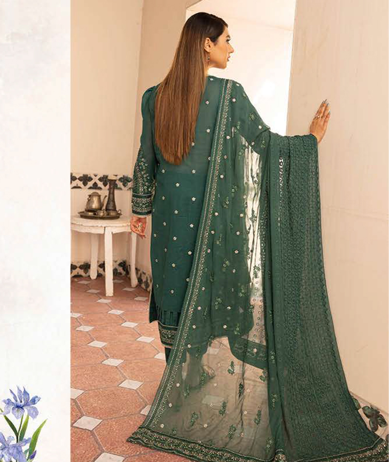 Pinks Vol-03 JH-478 * Heavy Embroidered Shirt * Embroidered Back * Embroidered Sleeves * Embroidered chiffon Dupatta * Plain Trouser * Embroidered Tissue