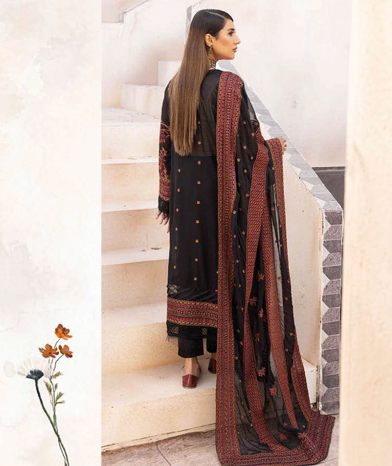 Pinks Vol-03 JH-481 * Heavy Embroidered Shirt * Embroidered Back * Embroidered Sleeves * Embroidered chiffon Dupatta * Plain Trouser * Embroidered Tissue