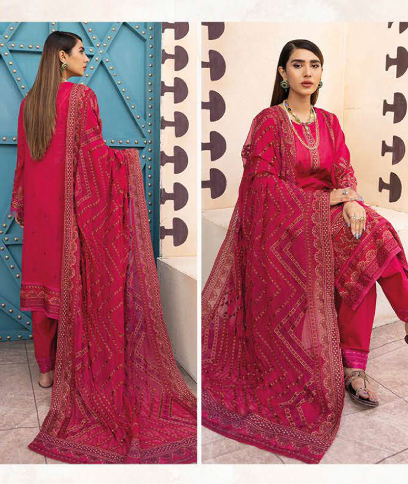 Pinks Vol-03 JH-482 * Heavy Embroidered Shirt * Embroidered Back * Embroidered Sleeves * Embroidered chiffon Dupatta * Plain Trouser * Embroidered Tissue