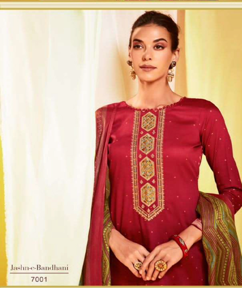 Jashn-e-Bandhani 7001 *Top Pure Viscose Jam Satin Digital Print With Heavy Neck & Daman Embroidery *Bottom Pure cotton dyed salwar *Dupatta Digital Print Box Pallu Lawn Dupatta