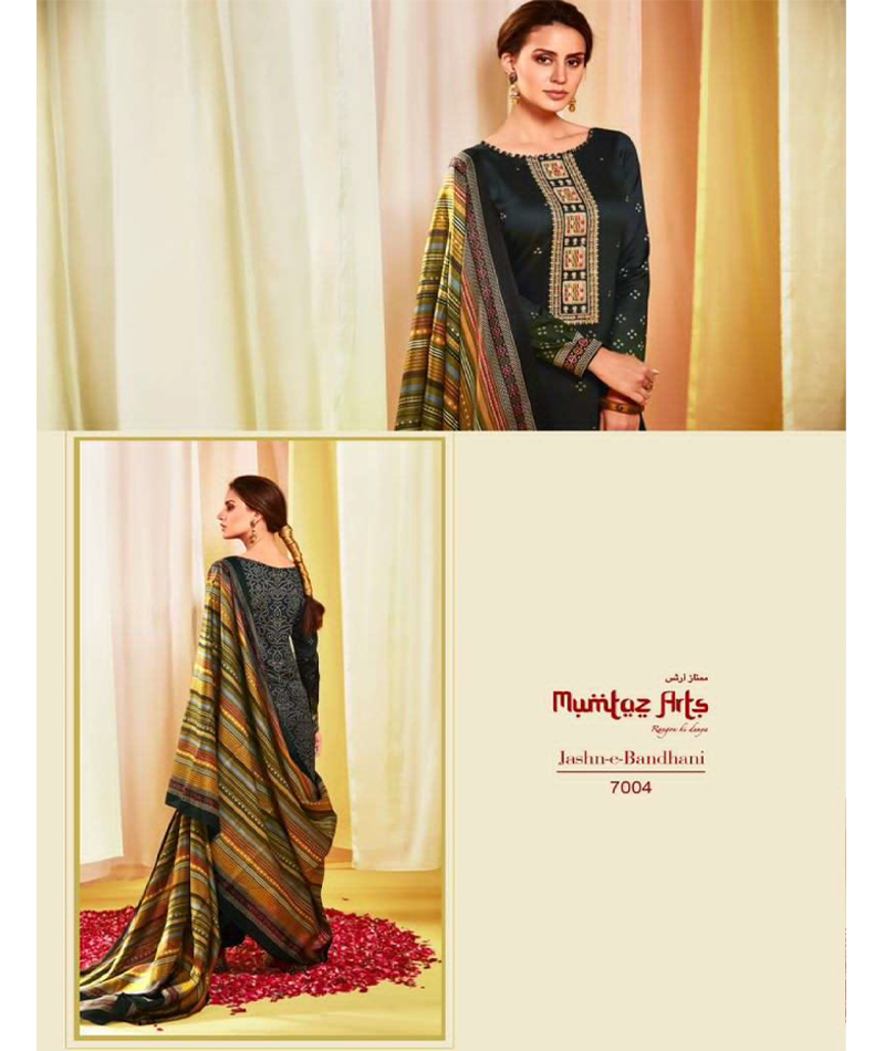 Jashn-e-Bandhani 7004 *Top Pure Viscose Jam Satin Digital Print With Heavy Neck & Daman Embroidery *Bottom Pure cotton dyed salwar *Dupatta Digital Print Box Pallu Lawn Dupatta