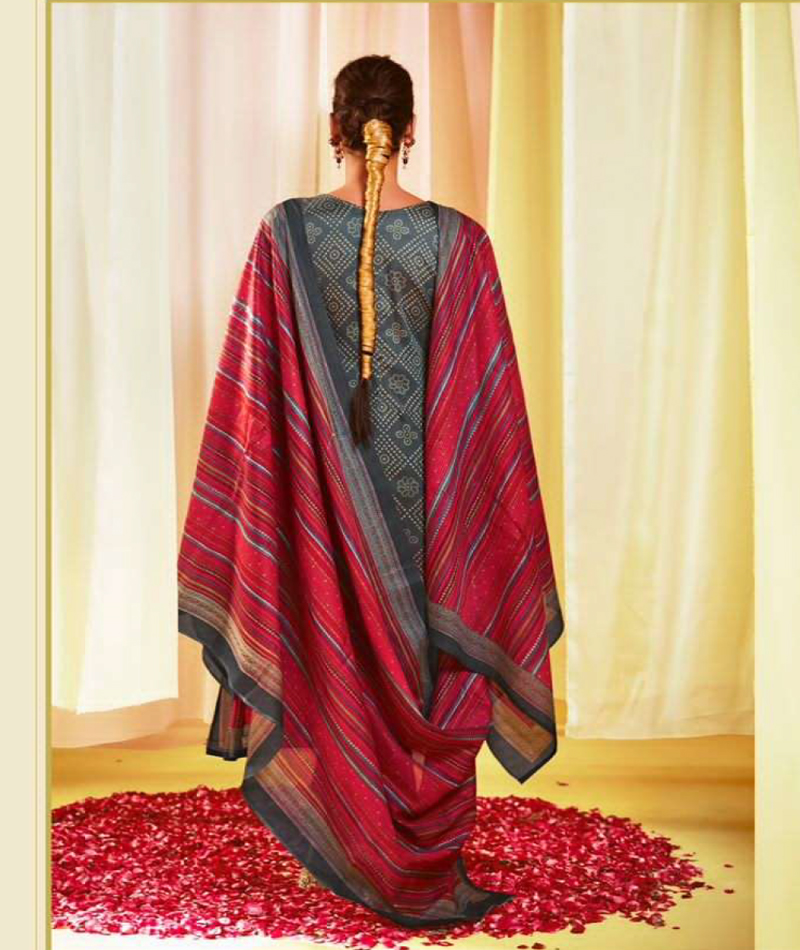 Jashn-e-Bandhani 7005 *Top Pure Viscose Jam Satin Digital Print With Heavy Neck & Daman Embroidery *Bottom Pure cotton dyed salwar *Dupatta Digital Print Box Pallu Lawn Dupatta