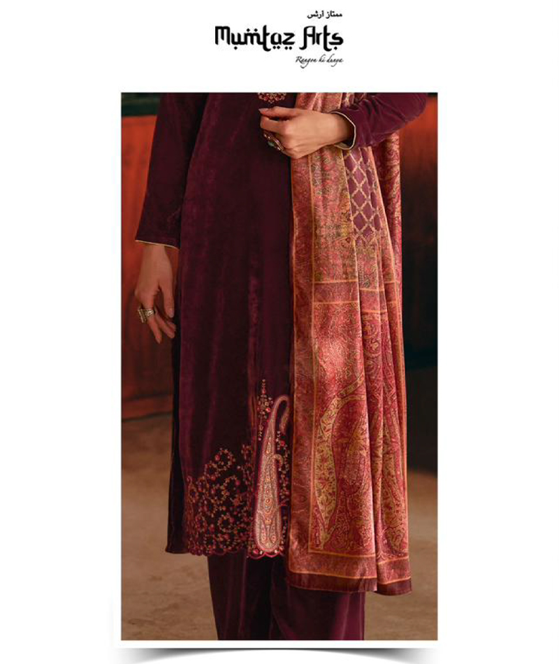 Dhun-Velvet 43003 *Top Pure velvet With Heavy Neck & Daman Embroidery With Scalping Work *Bottom Pure Velvet Dyed *Dupatta Pure Velvet Box Pallu Digital Print