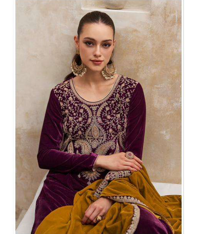 Ritha-55001 *Top Pure velvet With Heavy Neck Embroidery With Daman Embroidery *Bottom Pure Velvet With Heavy Embroidery Applic Work With Four Side Embroidery Patti *Dupatta Pure Viscose Pashmina Dyed Solid