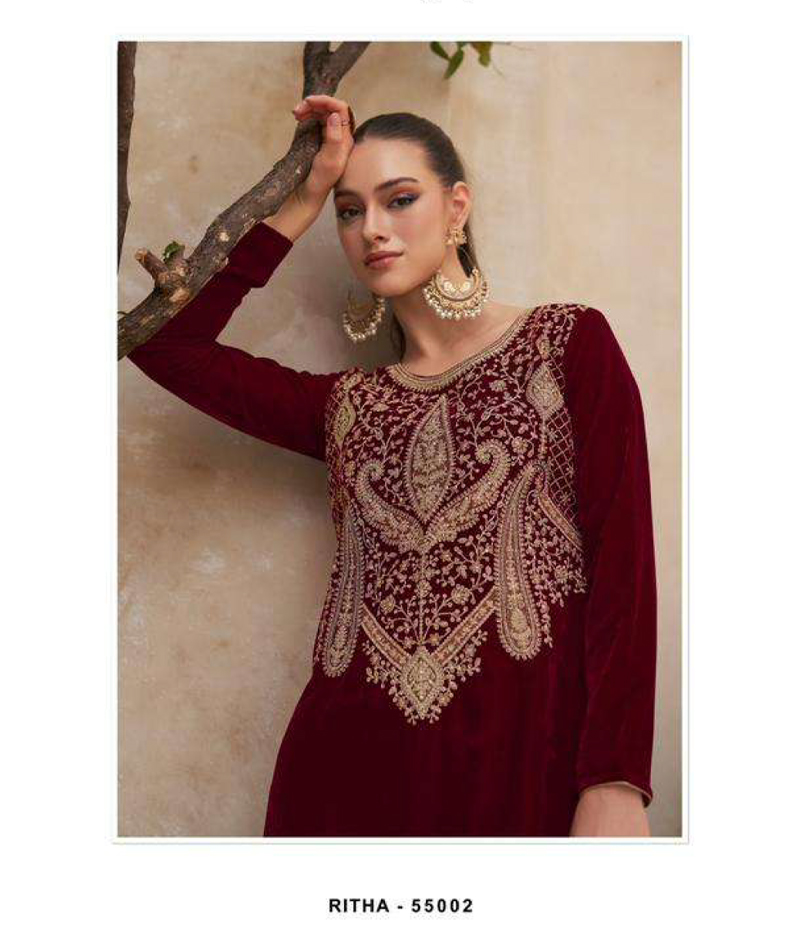 Ritha-55002 *Top Pure velvet With Heavy Neck Embroidery With Daman Embroidery *Bottom Pure Velvet With Heavy Embroidery Applic Work With Four Side Embroidery Patti *Dupatta Pure Viscose Pashmina Dyed Solid