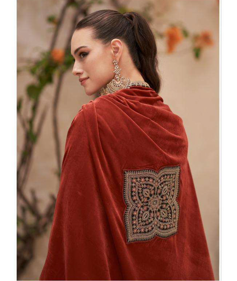 Ritha-55004 *Top Pure velvet With Heavy Neck Embroidery With Daman Embroidery *Bottom Pure Velvet With Heavy Embroidery Applic Work With Four Side Embroidery Patti *Dupatta Pure Viscose Pashmina Dyed Solid
