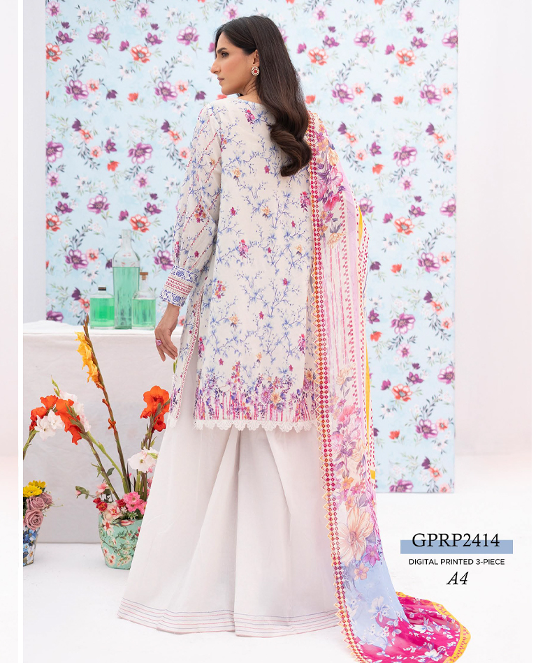 Rang Pasand- A4 * Luxury Digital Printed Lawn Embroidary Neck Front * Luxury Digital Printed Lawn Back/Sleeves * Digital Printed Bamber Chiffon Embroidary Cut-Work Dupatta * Dyed Cambric Cotton Trouser