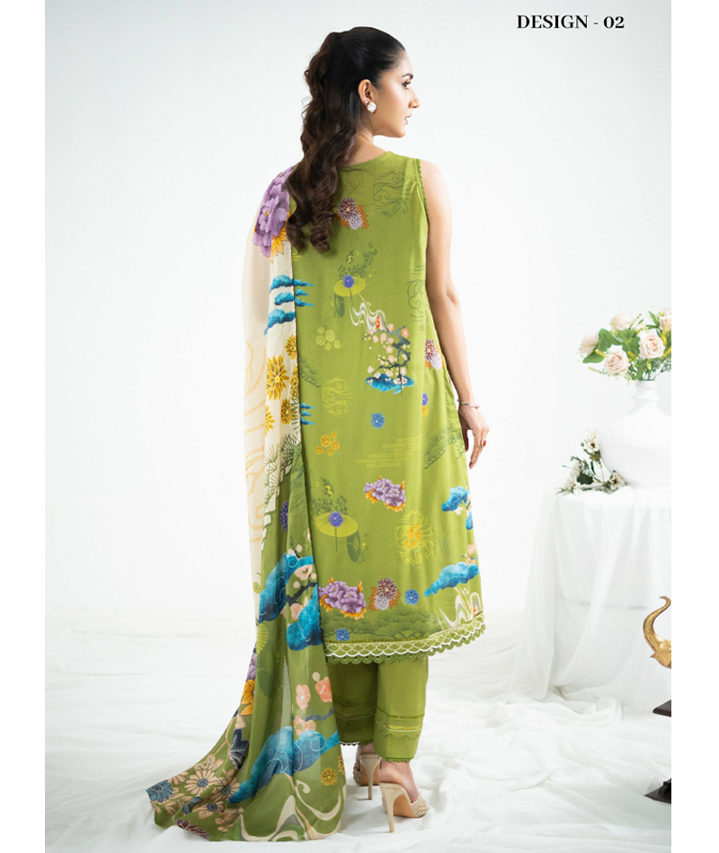 Lalam by Binaas- 02 * Digital Printed Lawn Embroidered * Neck With Boring Embroidered Front * Digital Printed Lawn Back * Digital Printed Lawn Sleeves * Digital Printed Silk Duppata * Dyed Cambric Cotton Trouser