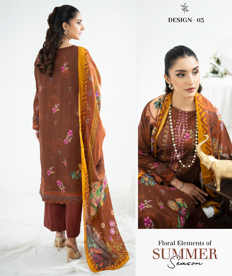 Lalam by Binaas- 03 * Digital Printed Lawn Embroidered * Neck With Boring Embroidered Front * Digital Printed Lawn Back * Digital Printed Lawn Sleeves * Digital Printed Silk Duppata * Dyed Cambric Cotton Trouser