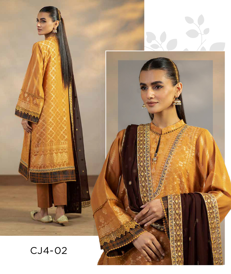 Cambric Jacquard Vol 01 CJ4-02 * Dyed lawn Jacquard Front Back Sleeves * Embroidered Sleeves Patti * Embroidered Front Neckline Motif 1PCS * Embroidered Front +Back+Side Slit+neckline Patti * Cotton Dyed Trouser * Embroidered Dupatta Patti * Embroidered Dyed Chiffon Dupatta * Finishing Patti 1PCS