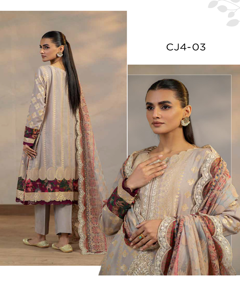 Cambric Jacquard Vol 01 CJ4-03 * Dyed lawn Jacquard Front Back Sleeves * Embroidered Sleeves Patti * Embroidered Front Neckline Motif 1PCS * Embroidered Front +Back+Side Slit+neckline Patti * Cotton Dyed Trouser * Embroidered Dupatta Patti * Embroidered Dyed Chiffon Dupatta * Finishing Patti 1PCS