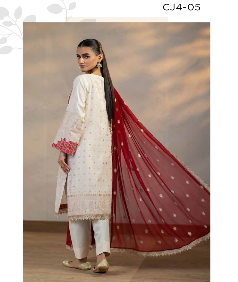 Cambric Jacquard Vol 01 CJ4-05 * Dyed lawn Jacquard Front Back Sleeves * Embroidered Sleeves Patti * Embroidered Front Neckline Motif 1PCS * Embroidered Front +Back+Side Slit+neckline Patti * Cotton Dyed Trouser * Embroidered Dupatta Patti * Embroidered Dyed Chiffon Dupatta * Finishing Patti 1PCS