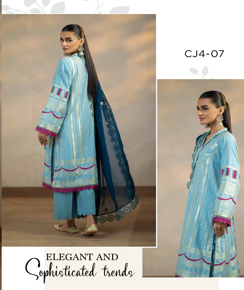 Cambric Jacquard Vol 01 CJ4-07 * Dyed lawn Jacquard Front Back Sleeves * Embroidered Sleeves Patti * Embroidered Front Neckline Motif 1PCS * Embroidered Front +Back+Side Slit+neckline Patti * Cotton Dyed Trouser * Embroidered Dupatta Patti * Embroidered Dyed Chiffon Dupatta * Finishing Patti 1PCS