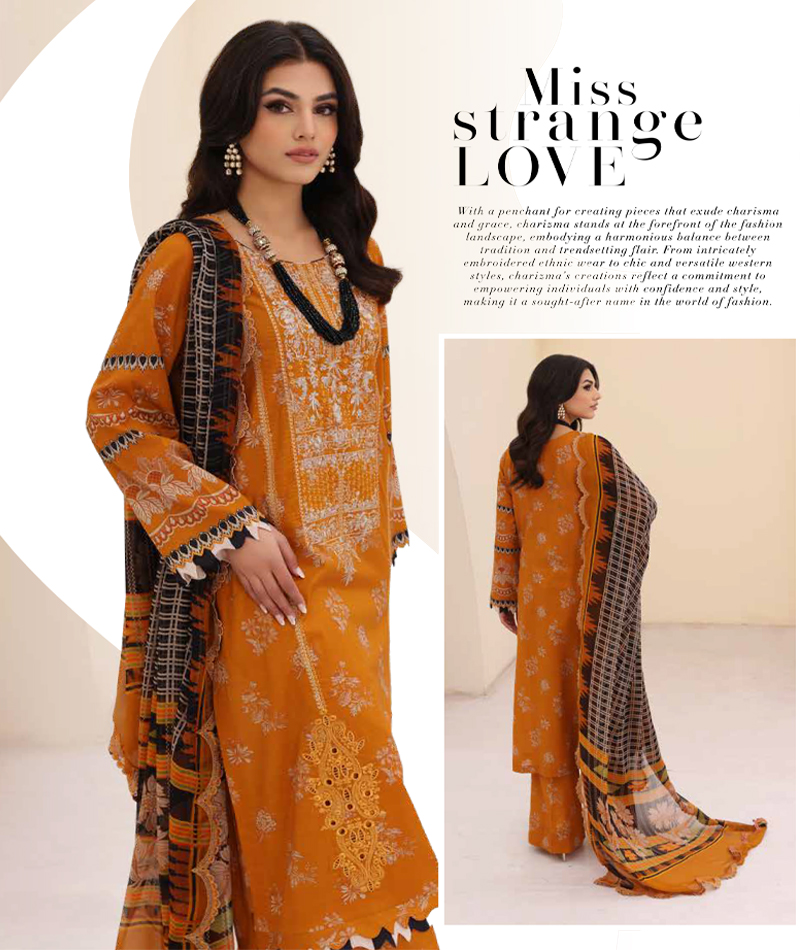 Naranji Vol 01 CN4-01 * Embroidered Printed lawn Front * Printed Lawn Back+Sleeves * Printed Cotton Trouser * Printed Chiffon Dupatta * Embroidered Dupatta