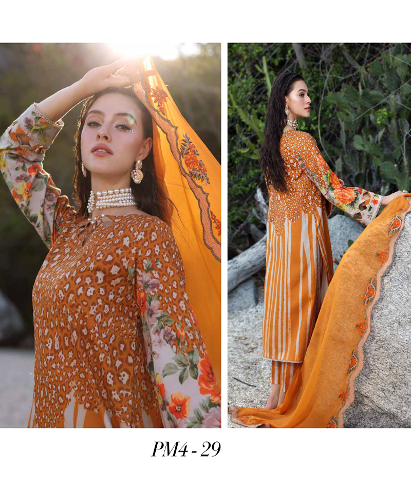 Print Melody Vol 04 PM4-29 * Printed Lawn Front+Back+Sleeves * Printed Cotton Trouser * Embroideried Dyed Chiffon Dupatta * Embroidered Dupatta Patti