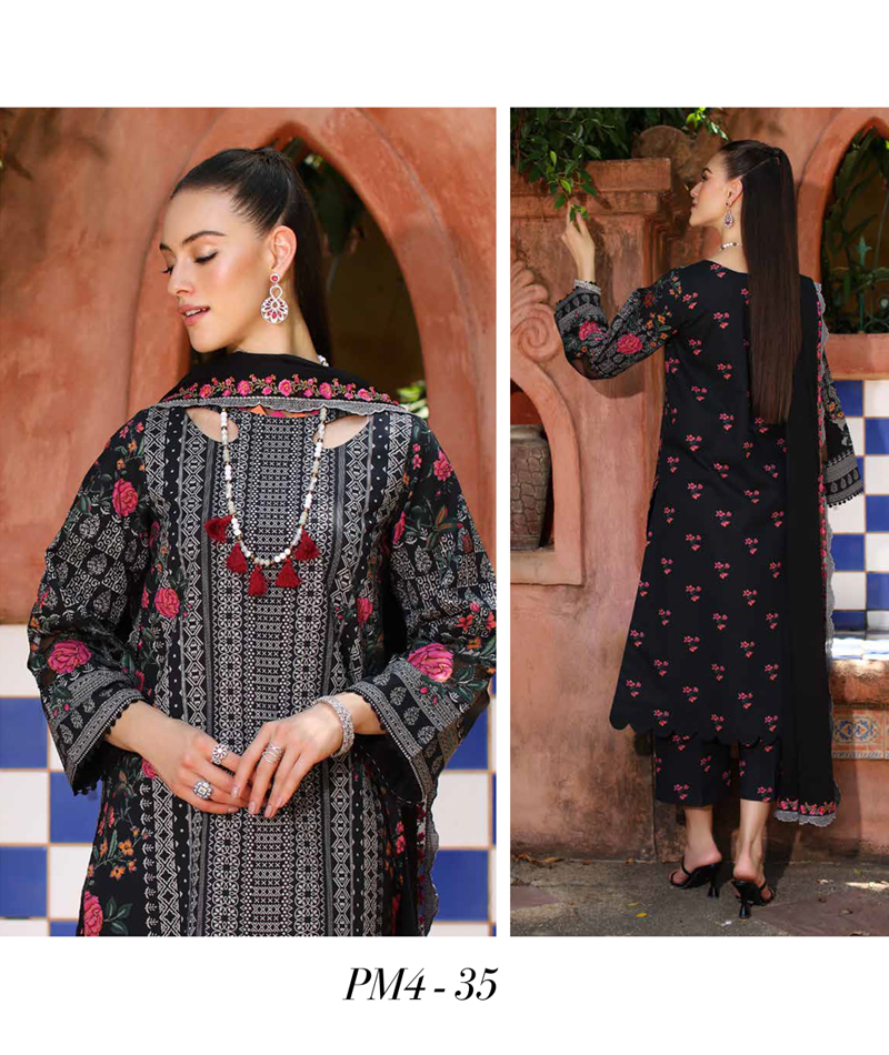 Print Melody Vol 04 PM4-35 * Printed Lawn Front+Back+Sleeves * Printed Cotton Trouser * Embroideried Dyed Chiffon Dupatta * Embroidered Dupatta Patti