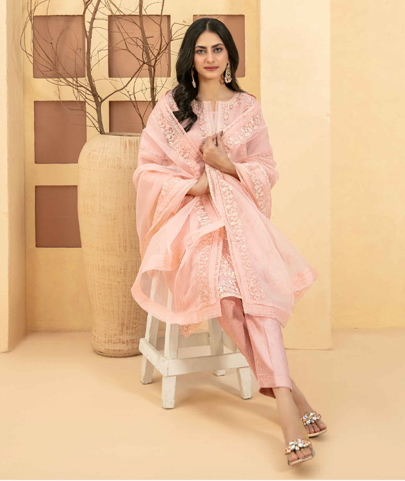 Taalea by Tawakkal- D2183 * Shirt- Stitched Embroidered Organza * Dupatta- Embroidered Organza * Trouser- Stitched Viscose Jacquard