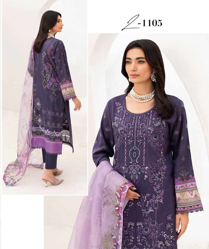 Mashaal Luxury Lawn Vol 11 L-1105 * Digital printed embroidered lawn front * Digital printed lawn back * Digital printed lawn sleeves * Embroidered lace for daman * Digital printed chiffon dupatta * Dyed lawn trouser