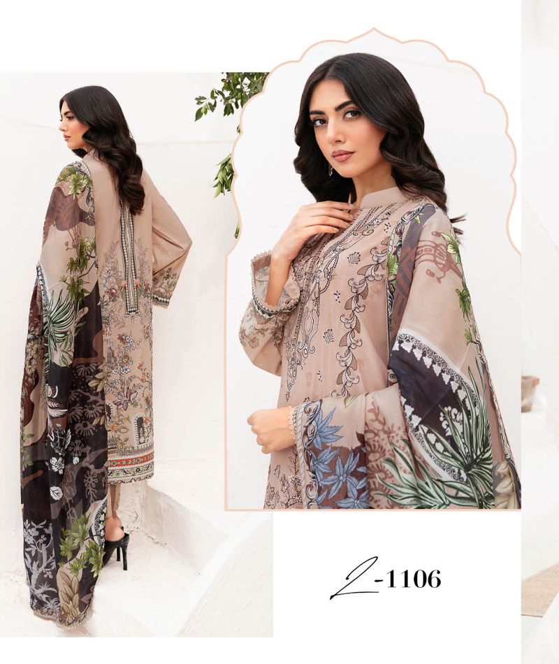 Mashaal Luxury Lawn Vol 11 L-1106 * Digital printed embroidered lawn front * Digital printed lawn back * Digital printed lawn sleeves * Embroidered lace for daman * Digital printed chiffon dupatta * Dyed lawn trouser
