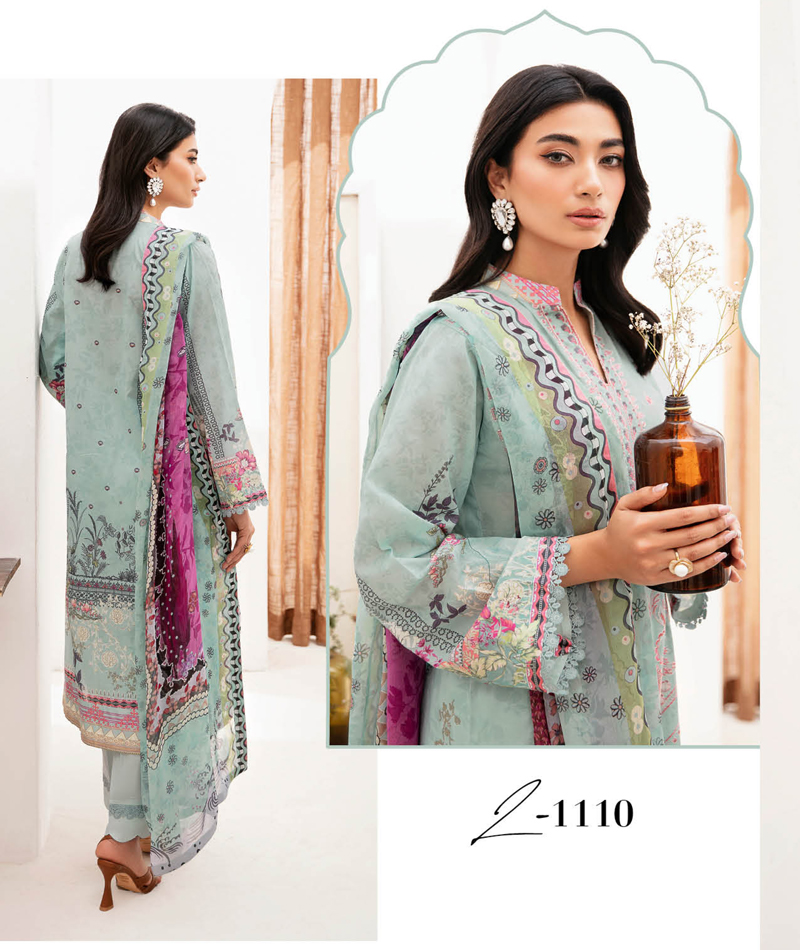 Mashaal Luxury Lawn Vol 11 L-1110 * Digital printed embroidered lawn front * Digital printed lawn back * Digital printed lawn sleeves * Embroidered lace for daman * Digital printed chiffon dupatta * Dyed lawn trouser